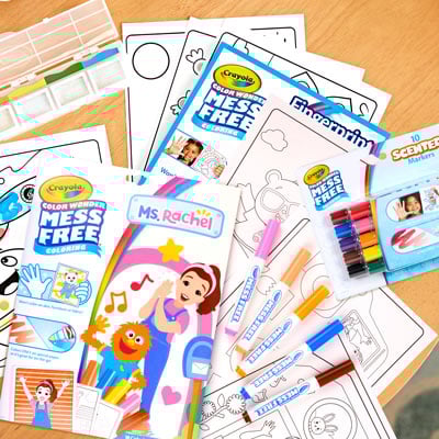 Mess free creative play with toys, coloring books, markers, and paint!