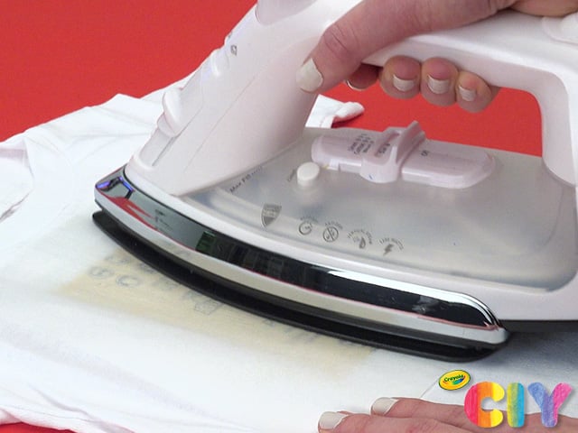 Place cardboard inside shirt. Place sandpaper design face down on shirt. Place parchment paper on top of sandpaper. Have an adult iron over design on low heat 3–5 minutes.