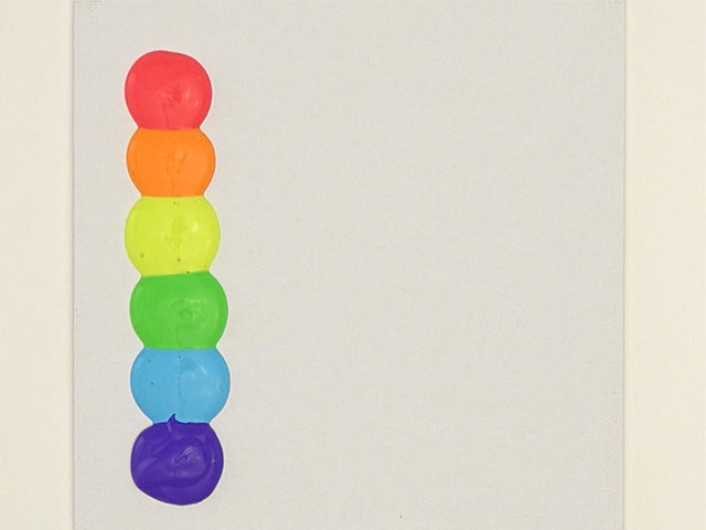 To create Rainbow Comb Painting: Pour small amount of each paint color onto canvas, overlapping slightly.