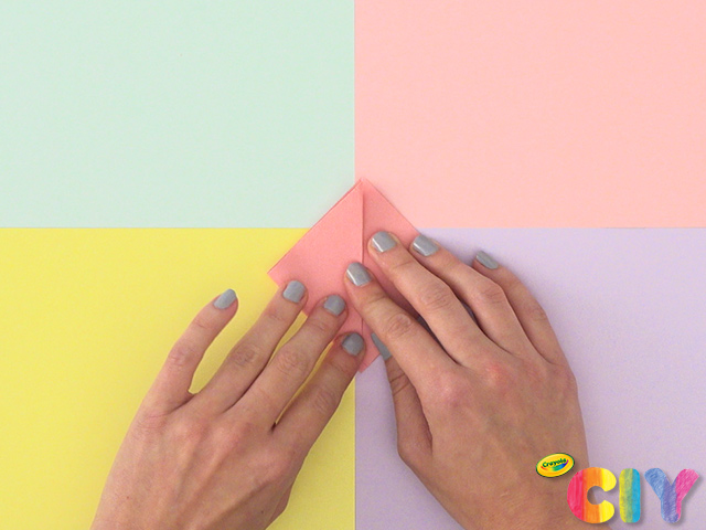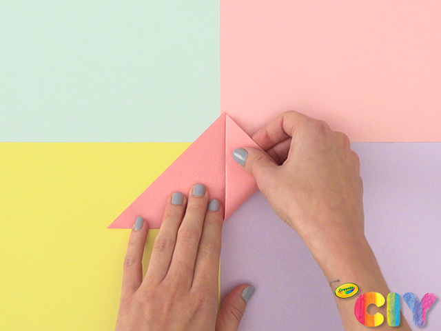 Fold in half to create triangle. Rotate so long edge is at bottom and right angle faces up.