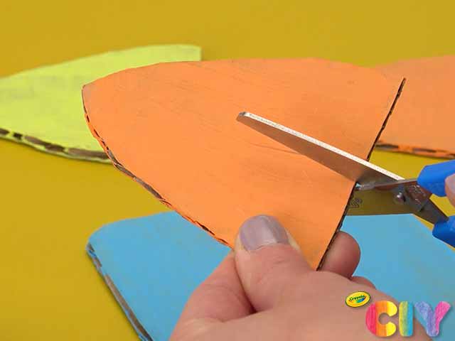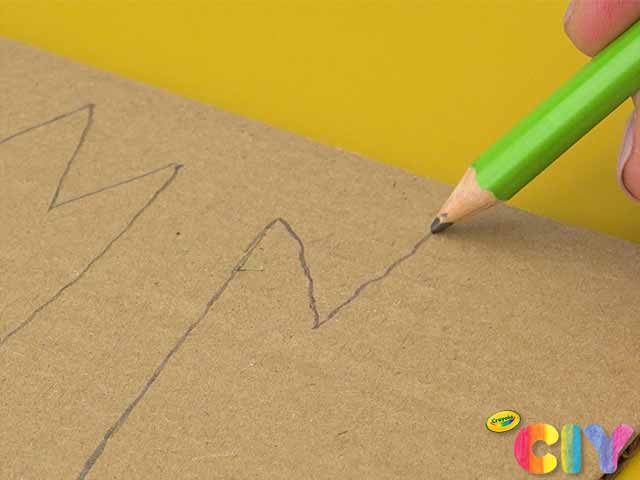 Sketch and cut out cardboard dinosaur body, scales, arms, legs, and feet.