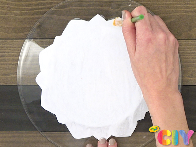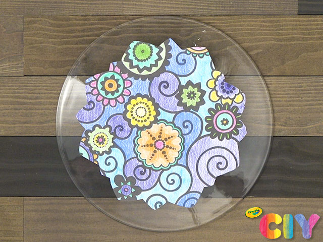 Turn a clear plate upside down. Using the plate for size reference, cut your coloring page into a unique design.