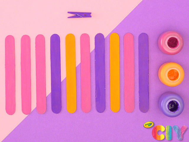 Cover both sides of 10 craft sticks and 1 clothespin with paint. Dry 1–2 hours. Add second coat. Dry 1–2 hours.