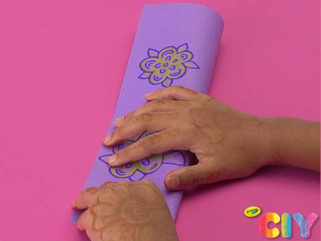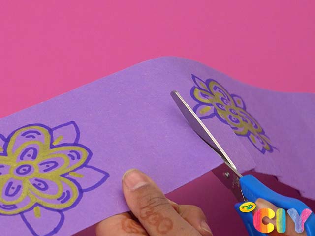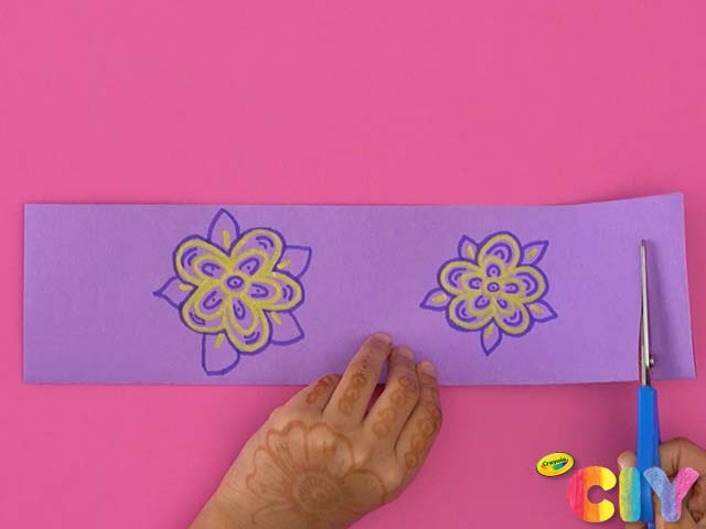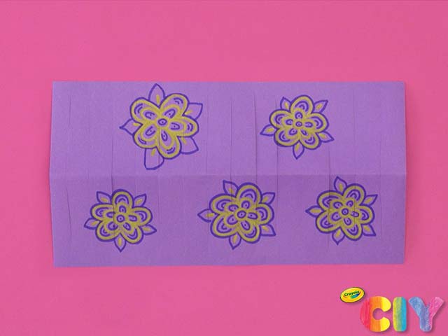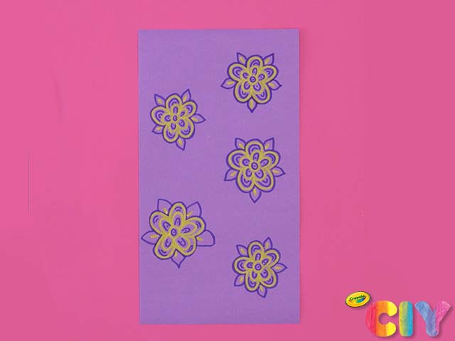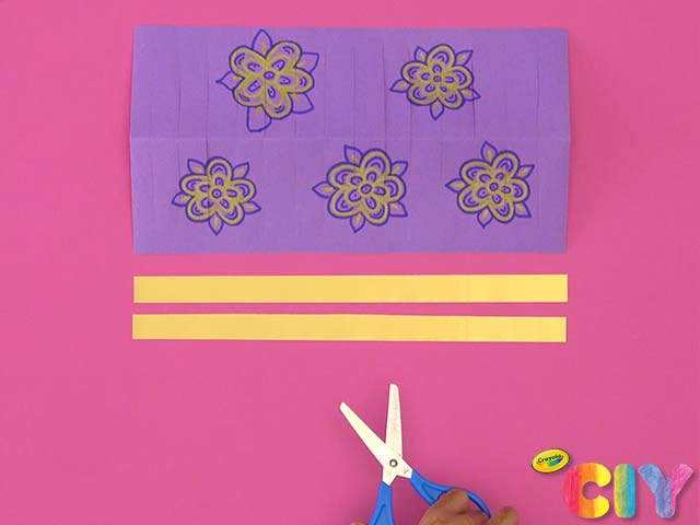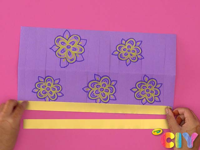 Glue gold paper strips to top and bottom edges of flowered construction paper.
