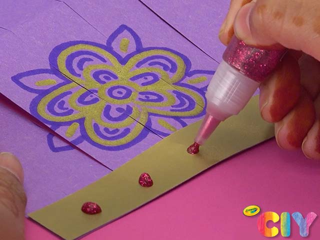 Add glitter glue designs to gold paper strips. Let all glue steps dry 3–4 hours.