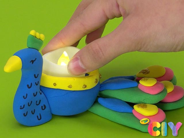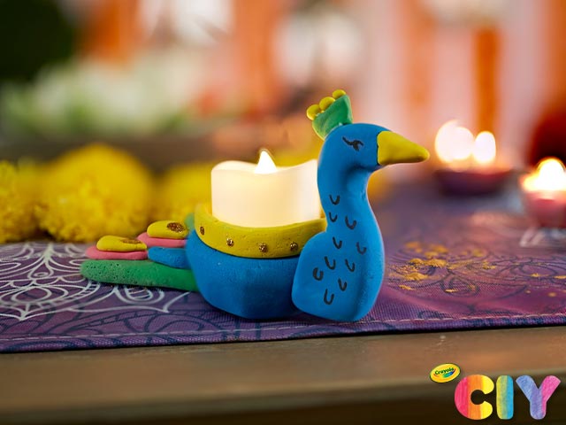 Celebrate Diwali with a Model Magic peacock diya craft for kids. Make your own colorful diya with a battery-operated tea light!