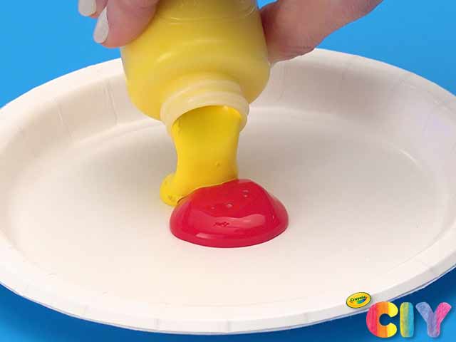 Pour red and yellow paint on plate. Mix with paint brush to create orange.