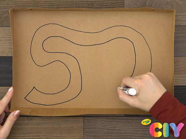 On bottom of upcycled shirt box, draw outline of curvy track with markers.