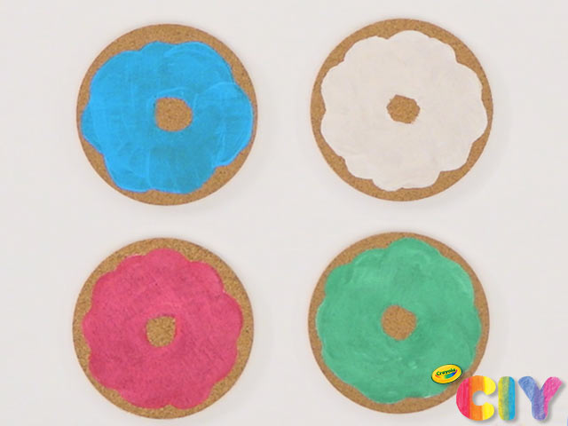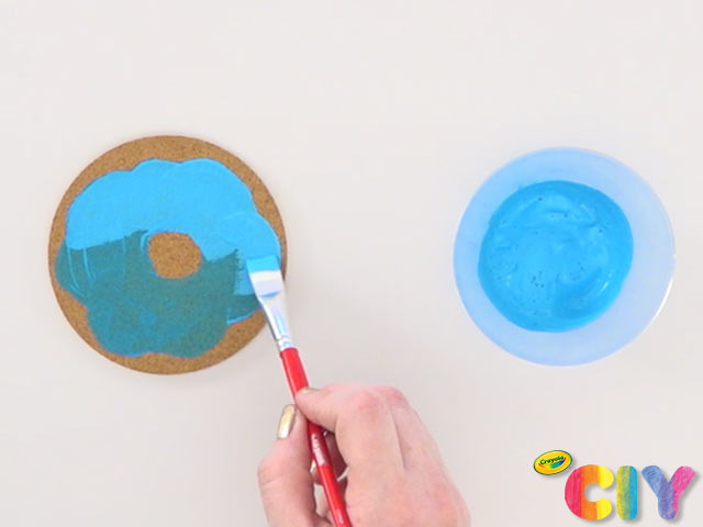 Paint donut frosting on coaster. Dry 1–2 hours. Add second coat. Dry 1–2 hours.