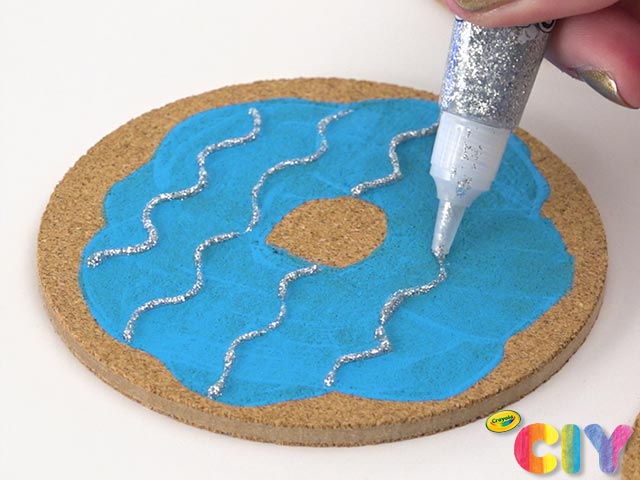 Add donut designs and details with glitter glue. Dry 3–4 hours.