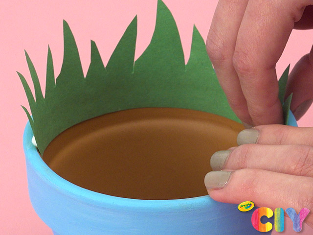 Cut out a patch of construction paper grass. Glue to inside of flower pot.
