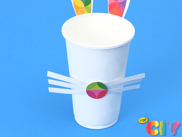 Glue whiskers to front of cup. Glue nose on top of whiskers. Let all glue steps dry 1–2 hours.