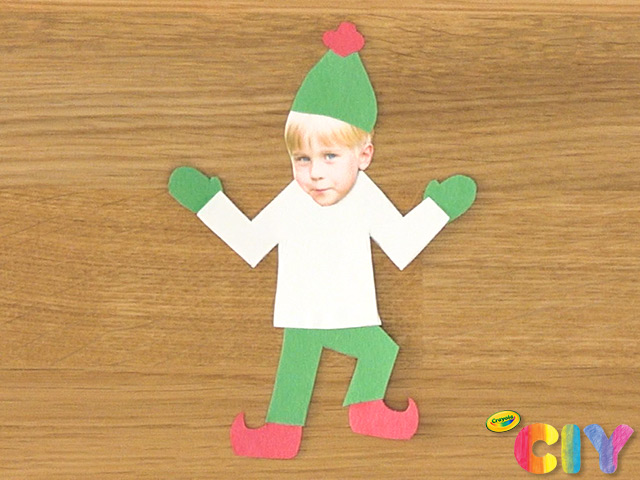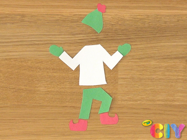 On construction paper, sketch elf character outfit, including shirt, pants, hat, and gloves. Cut out.