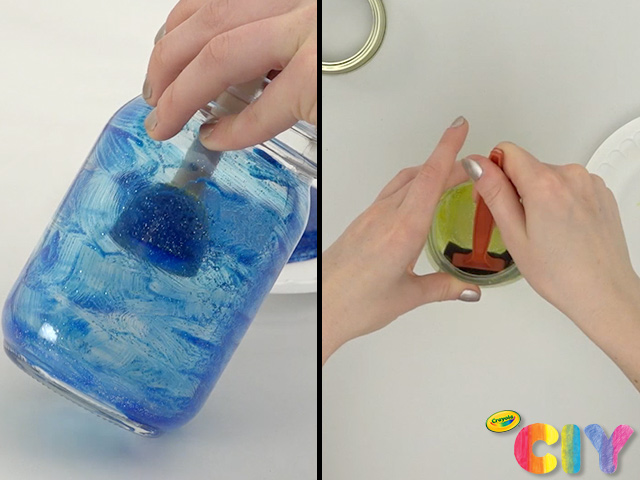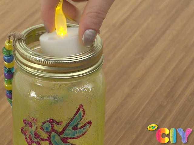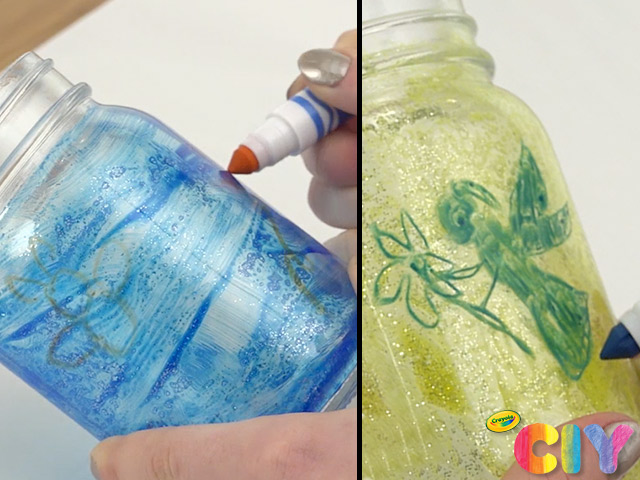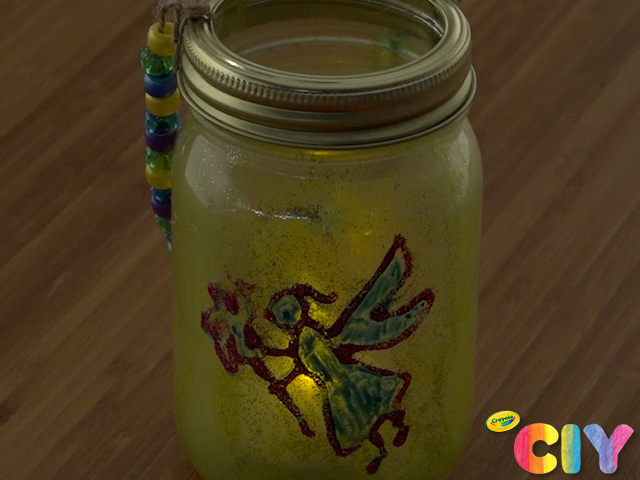 Using window markers, draw bugs or fairies on outside of jar.