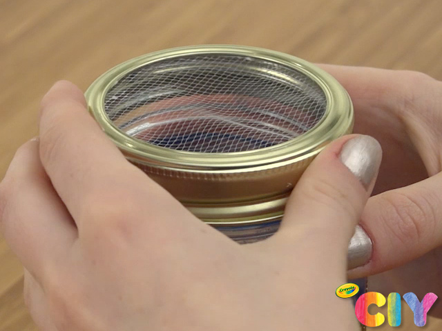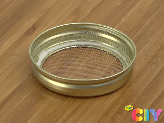 If completing Bug Jar, cut tulle into a circle so that it fits inside the disassembled lid rim when flipped over. Line inner rim with glue, lay in tulle, and fully secure with paint brush end. Dry 1–2 hours.