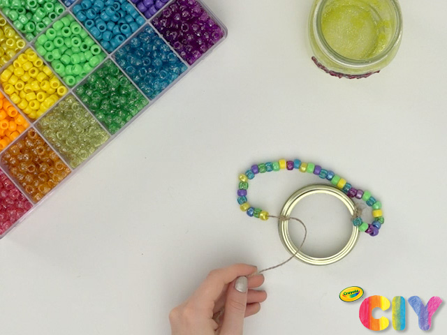 If completing Fairy Lantern, cut twine for lantern handle. Tie one end to disassembled lid rim, feed on beads, and tie other end to lid. Cut off any excess twine.
