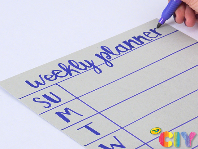 To create a weekly planner: Evenly space 8 rows down the length of the cardstock. Use permanent marker and write “Weekly Planner” in the top row. Create a column within the rows beneath to denote the day of the week.