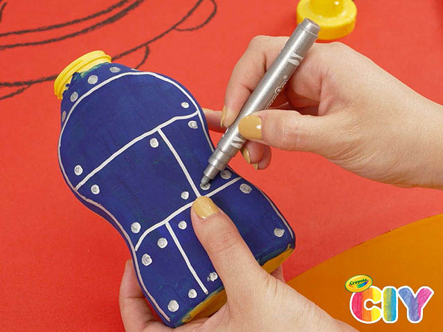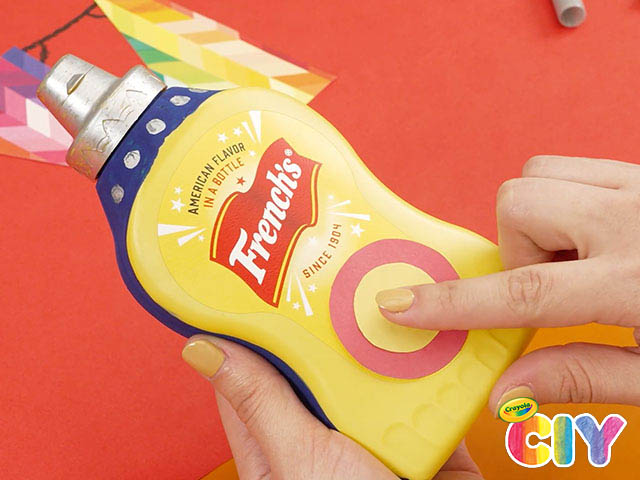 Using Crayola Metallic Markers, color the lid and draw details on the front/back of French's mustard container.