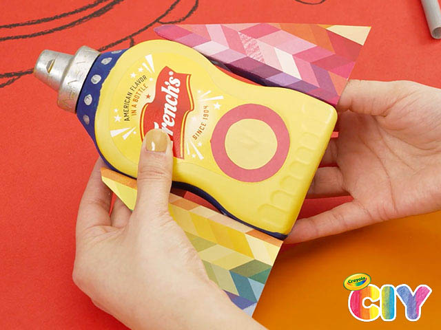Glue completed crayons to the left and right sides of French's Mustard container.