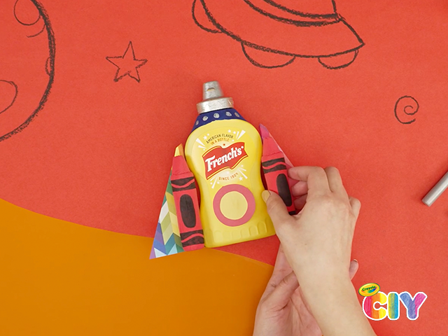 Go galactic with our DIY French's Mustard Bottle Model Magic Rocketship. This craft features an upcycled mustard bottle and two model magic crayon boosters. Create it today!