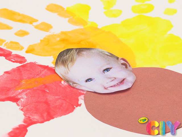 Cut out photo of child’s face. Glue to top of turkey body. Let all glue steps dry 15 minutes.