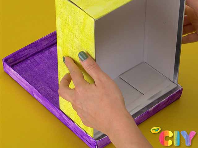 Cover outside of shoebox with paint. Dry 1–2 hours. Add second coat. Dry 1–2 hours.