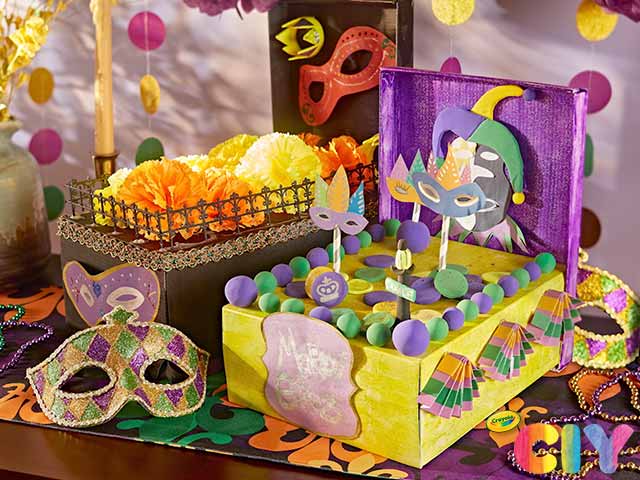 Mardi party! Join the parade at home by upcycling a shoebox into a colorful DIY Mardi Gras float.