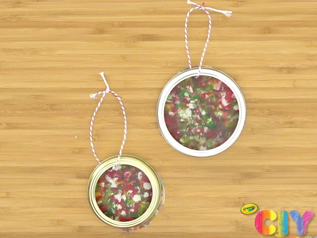 Create melted crayon art in the form of DIY ornaments. Melted crayon shavings and a few other supplies turn mason jar lids into homemade holiday decorations!