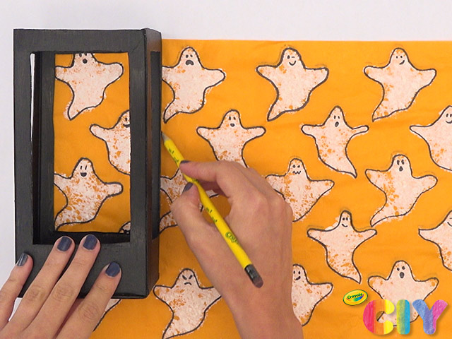 Using carton as a guide, sketch and cut out patterned tissue paper large enough for 1 panel.