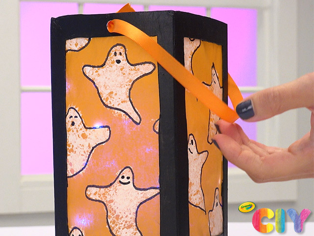 Hole punch 2 sides of lantern close to carton top. Feed ribbon through holes and tie into knots.