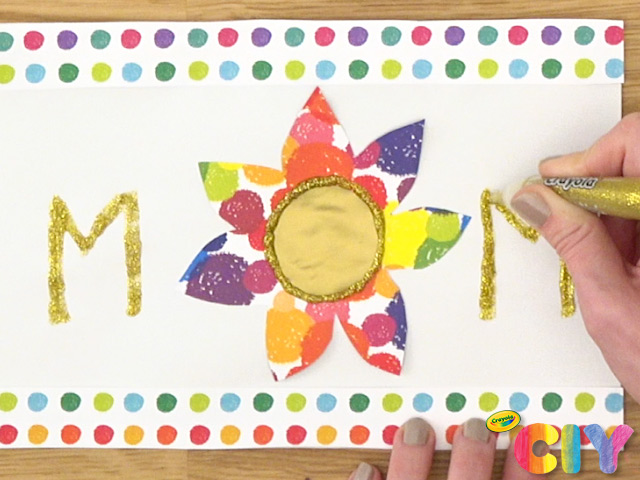 Take glitter glue tube and write out “MOM,” outlining the center circle of the flower to be the “O” letter.