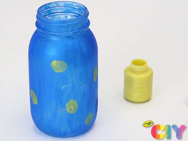 Place thumbprints around mason jar. Add more paint to thumb as needed. Dry 1–2 hours.
