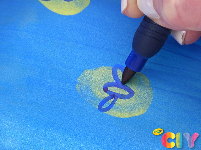 Draw firefly bodies on thumbprints with markers.