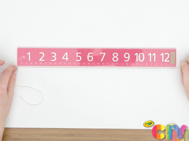 Measure and cut even lengths of white string, enough to fit the length of a wooden dowel.