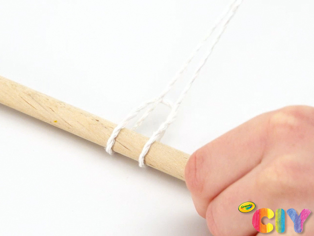 • Tie the string to the dowel in whatever method you prefer. We used lark head knots to secure our string.