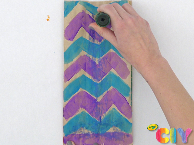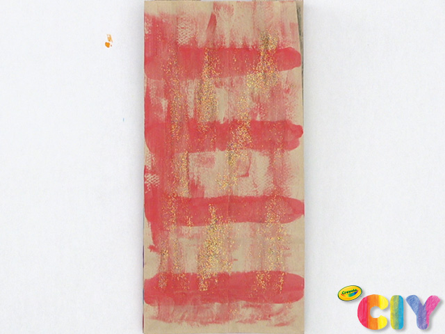 Decorate the large and bottom panel of a paper bag with paint and paint brush. Dry 1 hour.