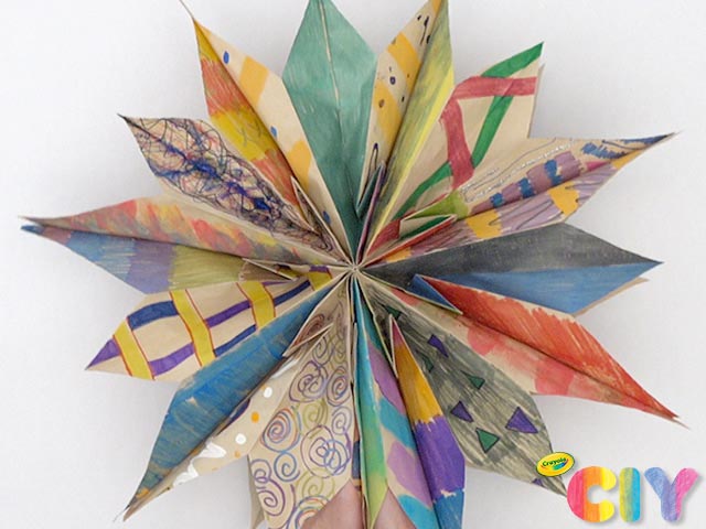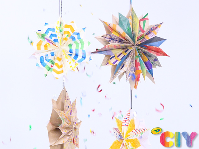 Hanging star decorations are now a colorful upcycled craft! Decorate leftover brown paper bags, then transform them into a DIY Paper Star.