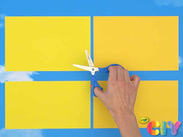 Cut a yellow shade of cardstock into 2 pieces measuring approximately 7”H x 9”W and 5”H x 9”W. Repeat with second sheet of cardstock.