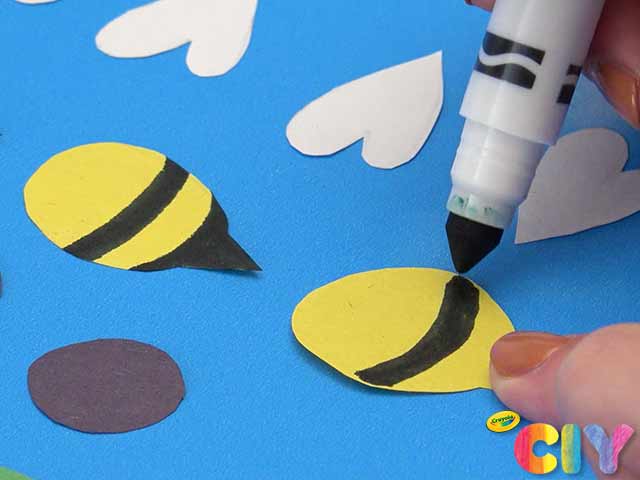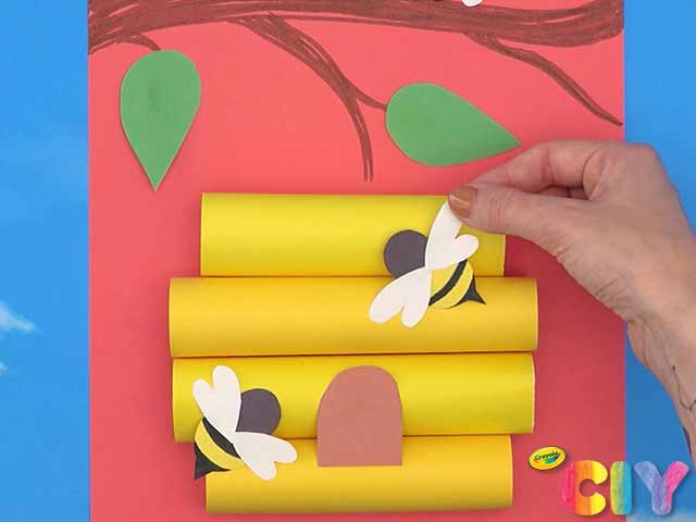 Sketch and cut out construction paper leaves, beehive entrance, and bees.