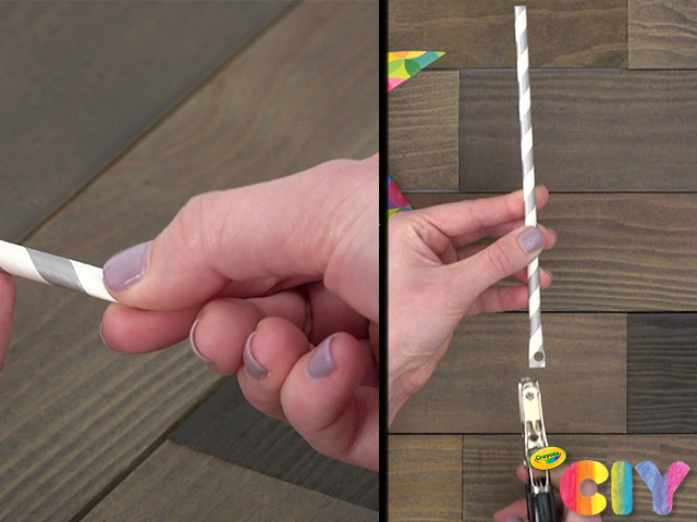 Place fastener through the hole in the straw and flatten legs to hold in place.