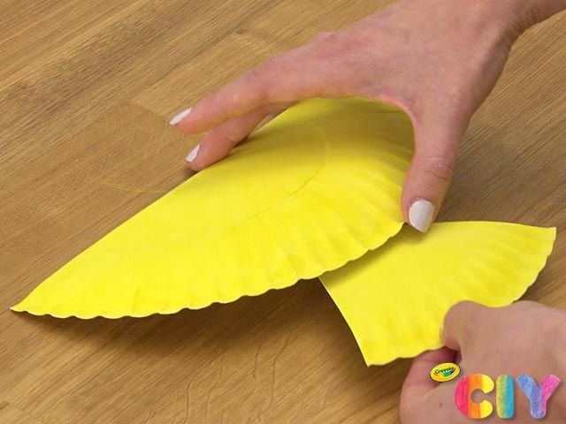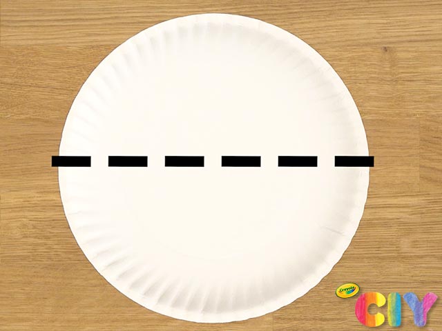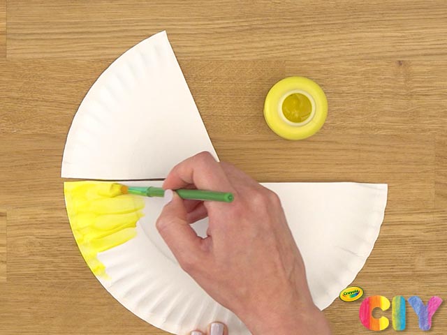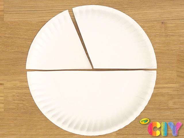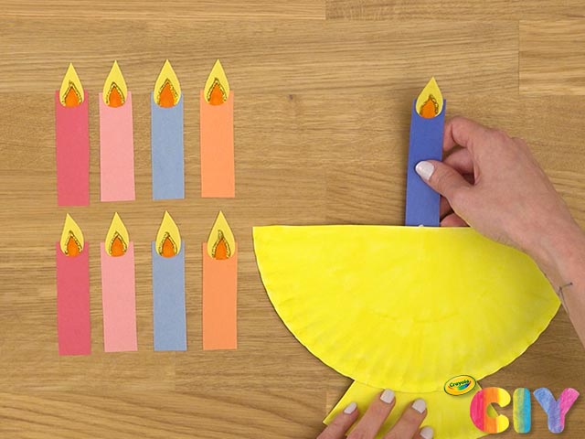 Glue paper plate slice to bottom of halved paper plate for menorah base.