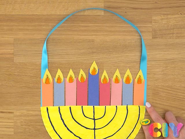 Attach ribbon to hang the DIY menorah. Let all glue steps dry 3–4 hours.