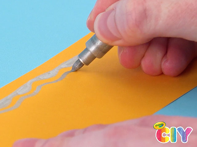 Draw Crayola Crayon Serpentine® lines onto a piece of Crayola Vivid Color Cardstock with silver Crayola Metallic Marker.