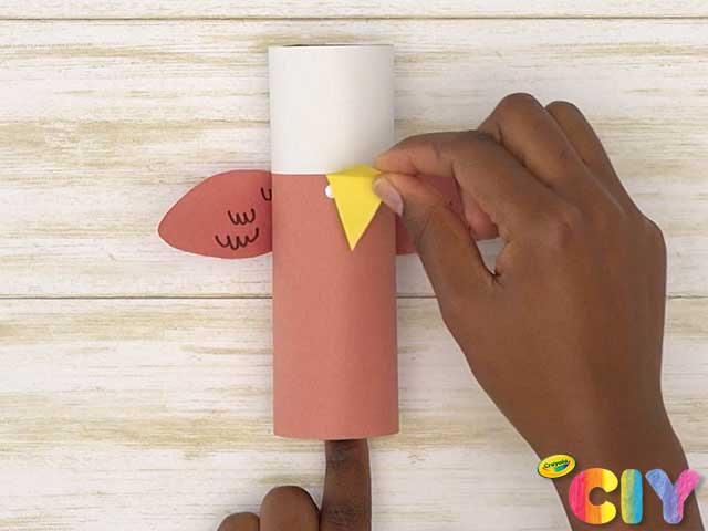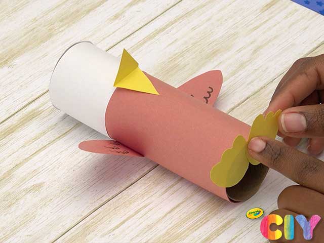 Fold yellow diamond in half to create beak shape. Glue beak to paper front of paper towel roll.