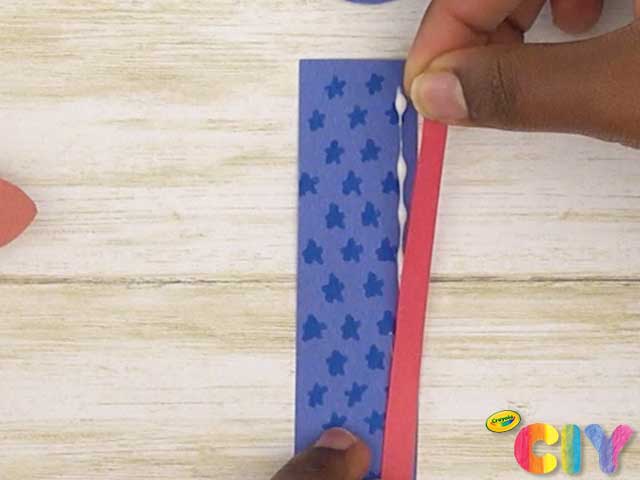 Glue red rectangle along edge of blue rectangle. Roll blue rectangle into cylinder and glue to secure.