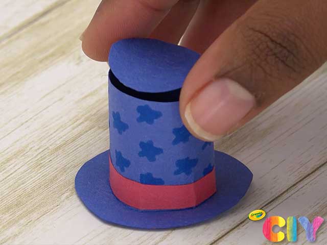 Stand cylinder up and glue to larger blue circle. Glue smaller blue circle on top of cylinder to finish hat.