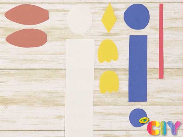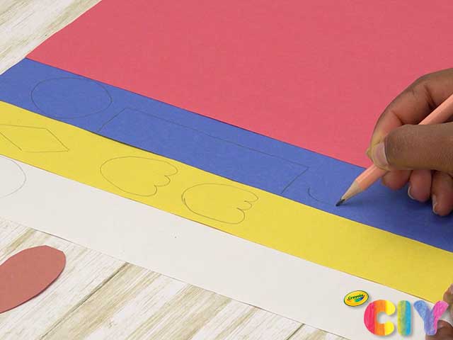 Sketch rectangle on blue construction paper approximately 6”H x 1.5”W. Sketch 2 circles on blue construction paper approximately 2”W and 1.5”W, respectively.