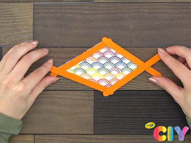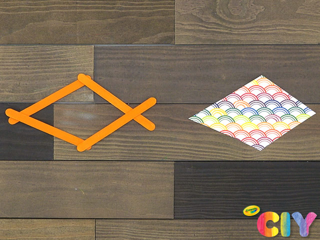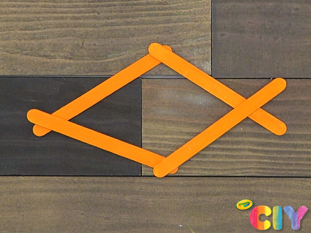Glue popsicle sticks in diamond shape to create fish body, leaving slight overhang on one side for tail. Dry 15–30 minutes.