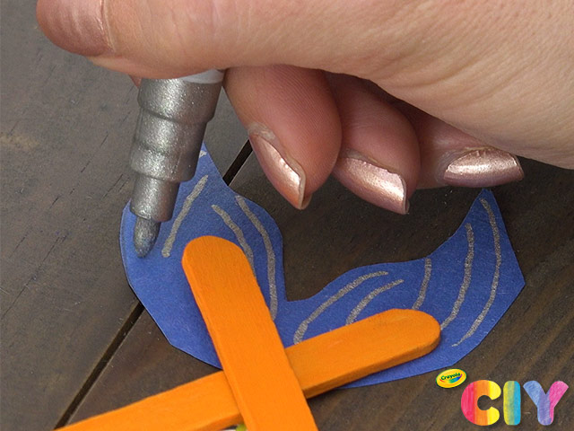 Sketch and cut out construction paper tail. Glue to back of popsicle sticks. Let all glue steps dry 15–30 minutes.