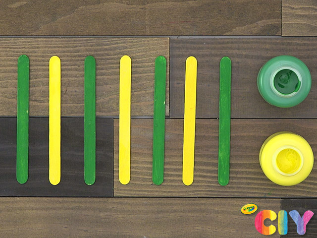 Cover 5–7 popsicle sticks with paint. Dry 1–2 hours. Add second coat. Dry 1–2 hours.